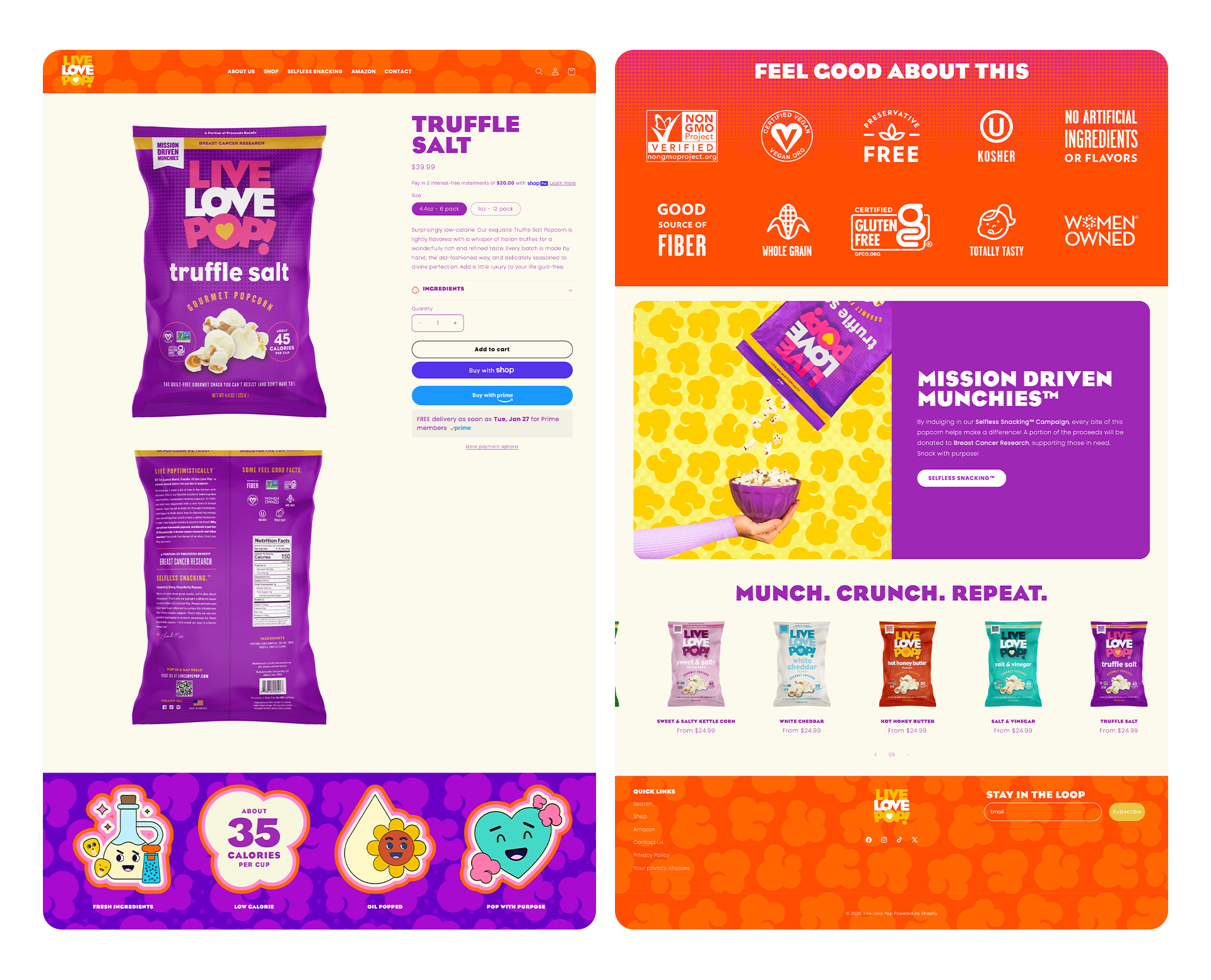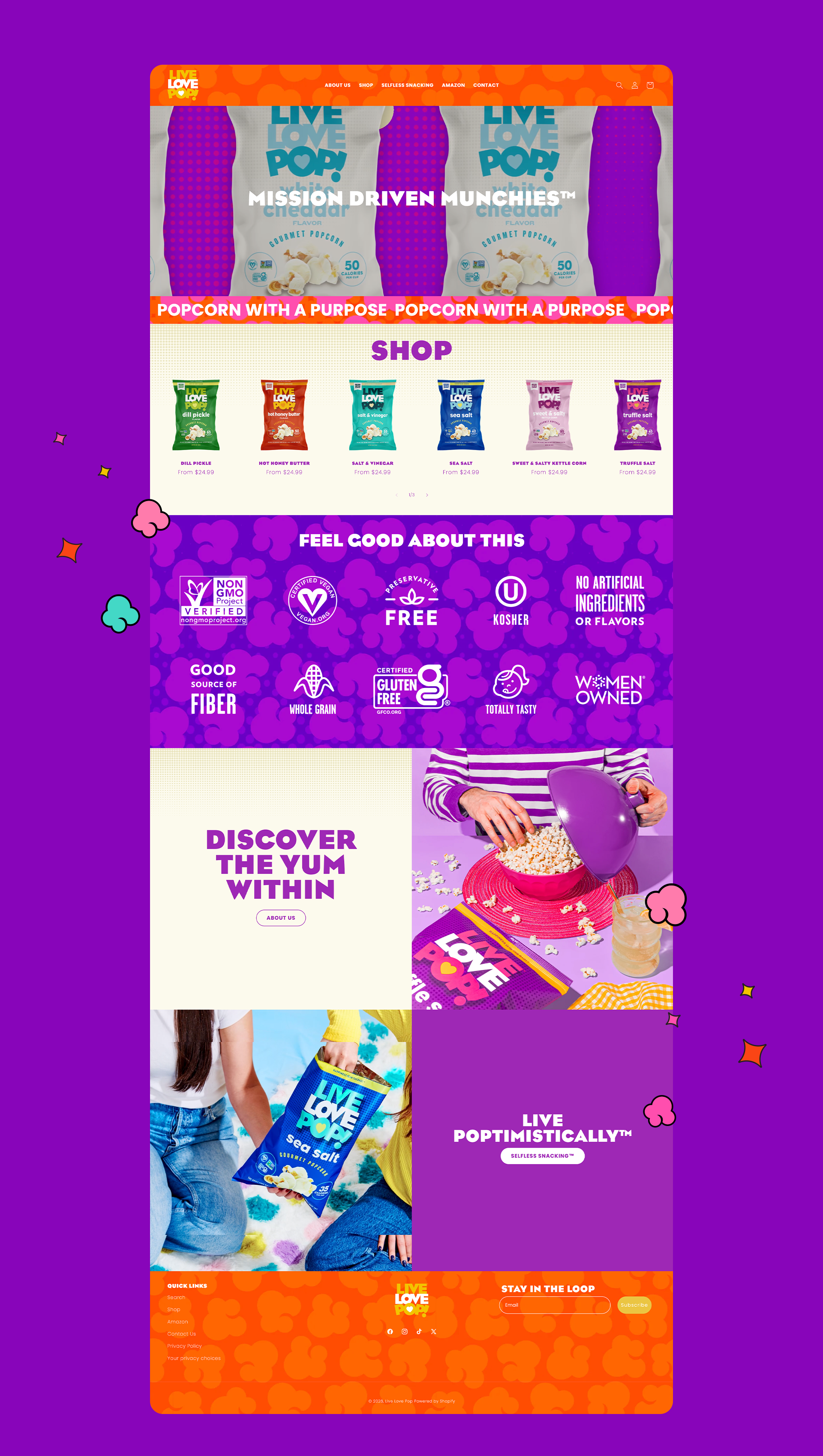 Live Love Pop is a mission-driven popcorn brand creating better-for-you snacks that give back. Each flavor supports a different cause, making purpose a core part of the product—not an afterthought. With strong placement in major retailers, the brand needed a direct-to-consumer experience that could scale with demand while clearly expressing its bold point of view.